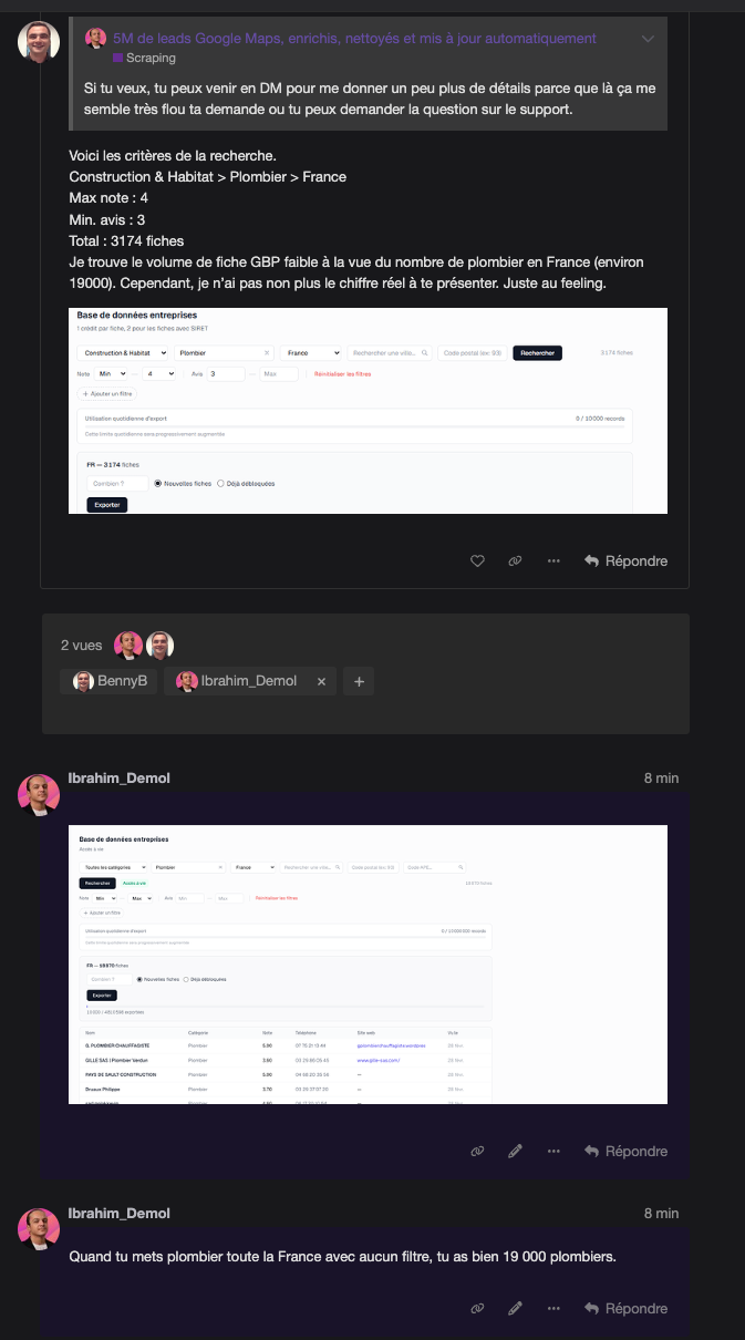 Benny est venu me voir en privé pour me dire qu’il trouvait le nombre de plombiers dans la base un peu faible. Il avait obtenu environ 3 174 fiches avec ses filtres, et comme il estimait qu’il devait y avoir autour de 19 000 plombiers en France, ça lui semblait peu. Il a précisé lui-même qu’il n’avait pas de chiffre réel à présenter, que c’était juste un feeling.
