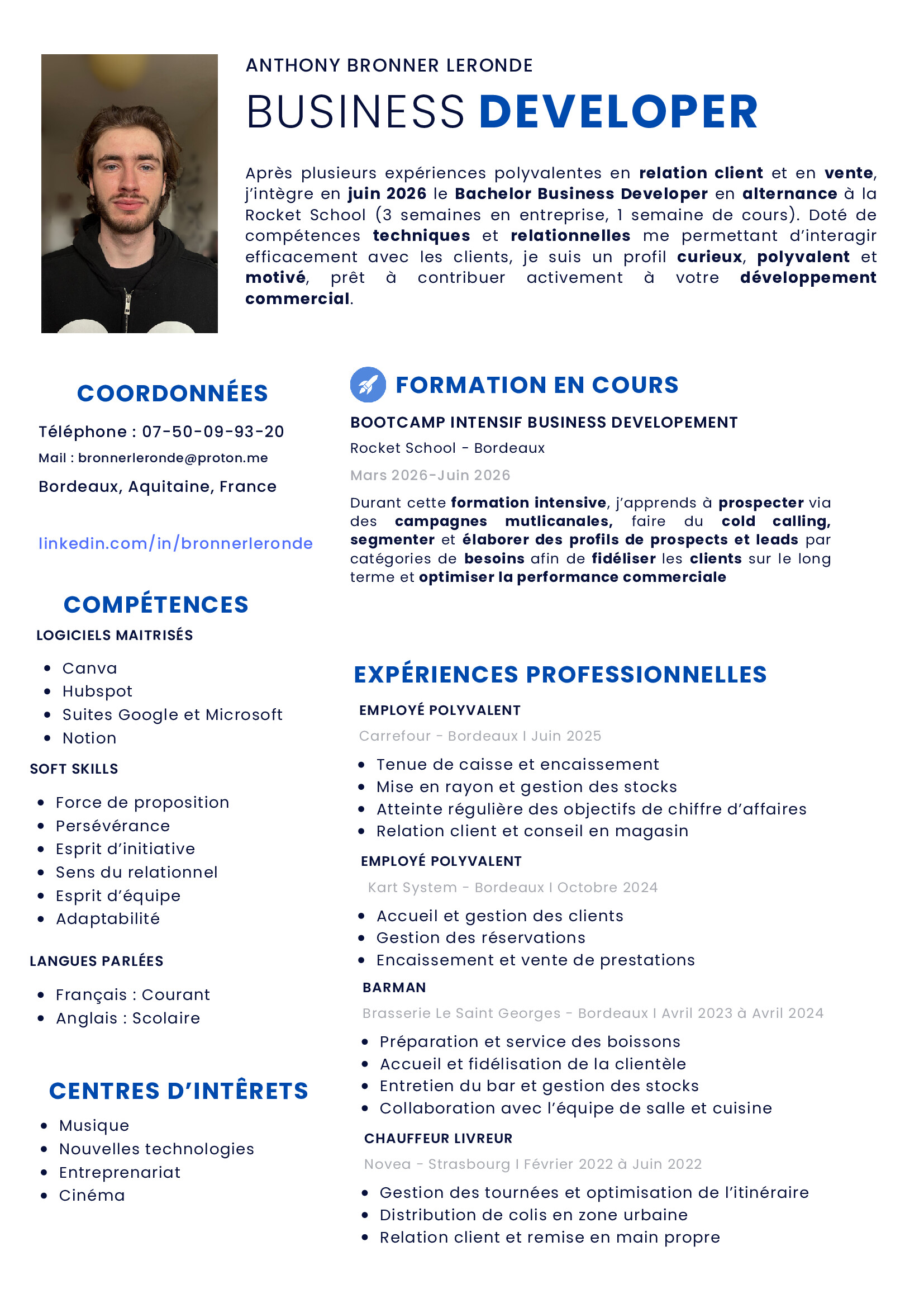 Si vous cherchez un profil de 22 ans motivé, polyvalent et prêt à faire grimper votre chiffre d’affaires, rencontrons-nous ! ![]()