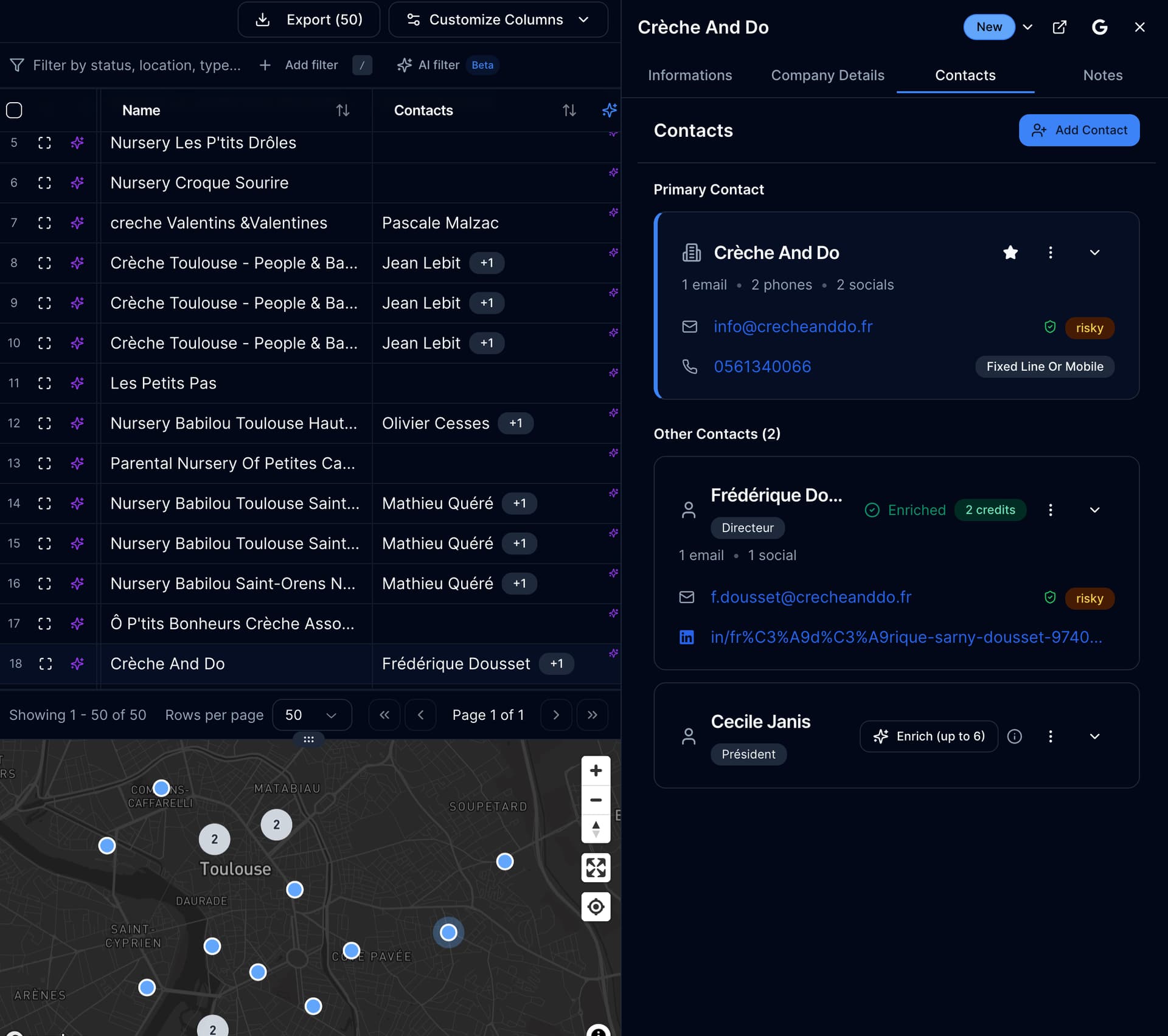 Si jamais cela vous intéresse, nous proposons un outil qui permet de faire des recherches comme sur Google Maps. On trouve automatiquement l’entreprise associée de data.gouv, et on propose de trouver les adresses e-mail pro, tel portable pro et linkedin des gérants.