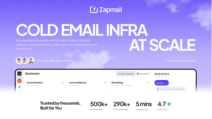 +1 pour Zapmail ! Ça marche très fort, j’ai vu aucune différence de délivrabilité par rapport à quand je le fais à la main, c’est super simple d’exporter les comptes un peu partout (et on a quasi jamais besoin de s’y connecter nous même). Et il y a même l’API pour les gros volumes.