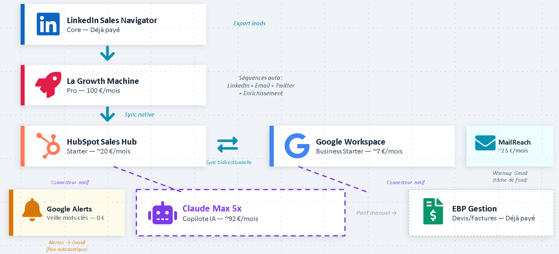 Franchement, pour débuter seul, évite l’usine à gaz. Le plus important au début, c’est de bien capter les besoins de tes prospects sur l’analyse d’eau, et comment tu peux les aider. Le reste de la stack, tu l’ajusteras au fur et à mesure, t’inquiète pas.