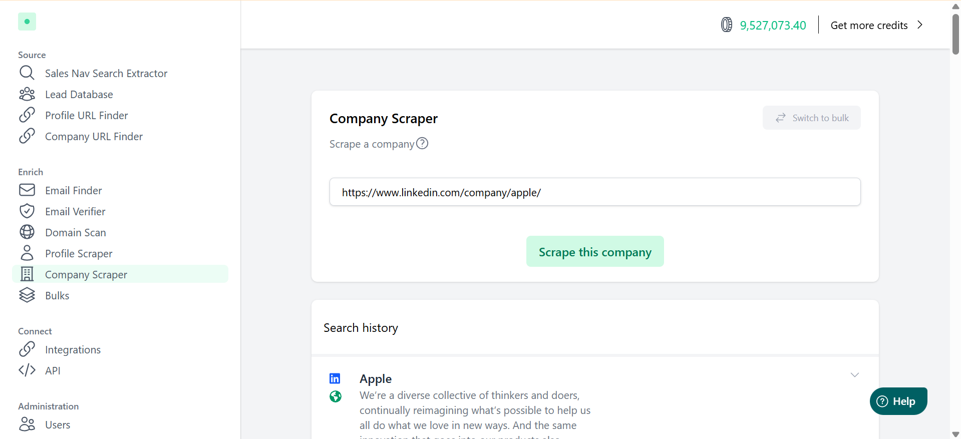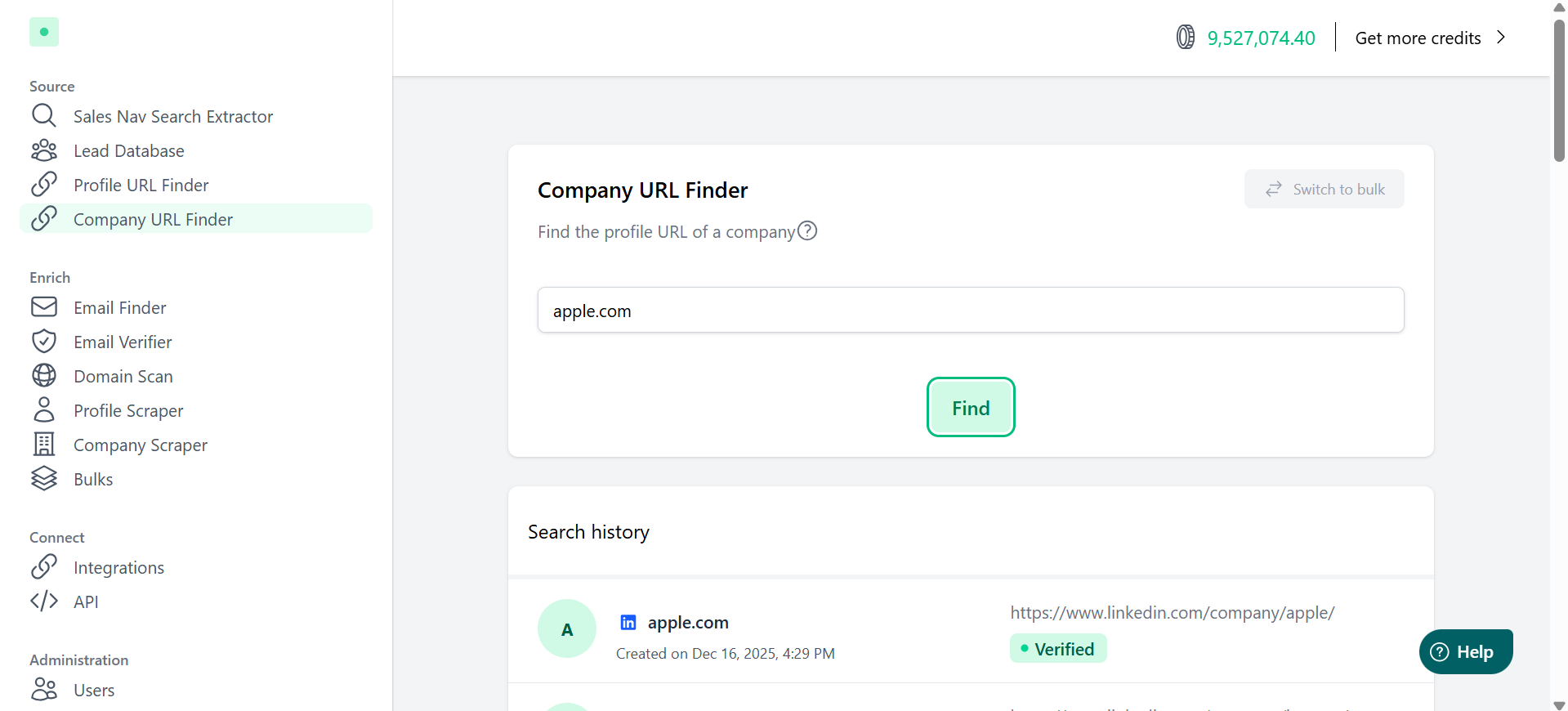 1/ Tu utilises notre Company URL Finder. Tu fournis le nom de domaine, on trouve la page Linkedin de l’entreprise :