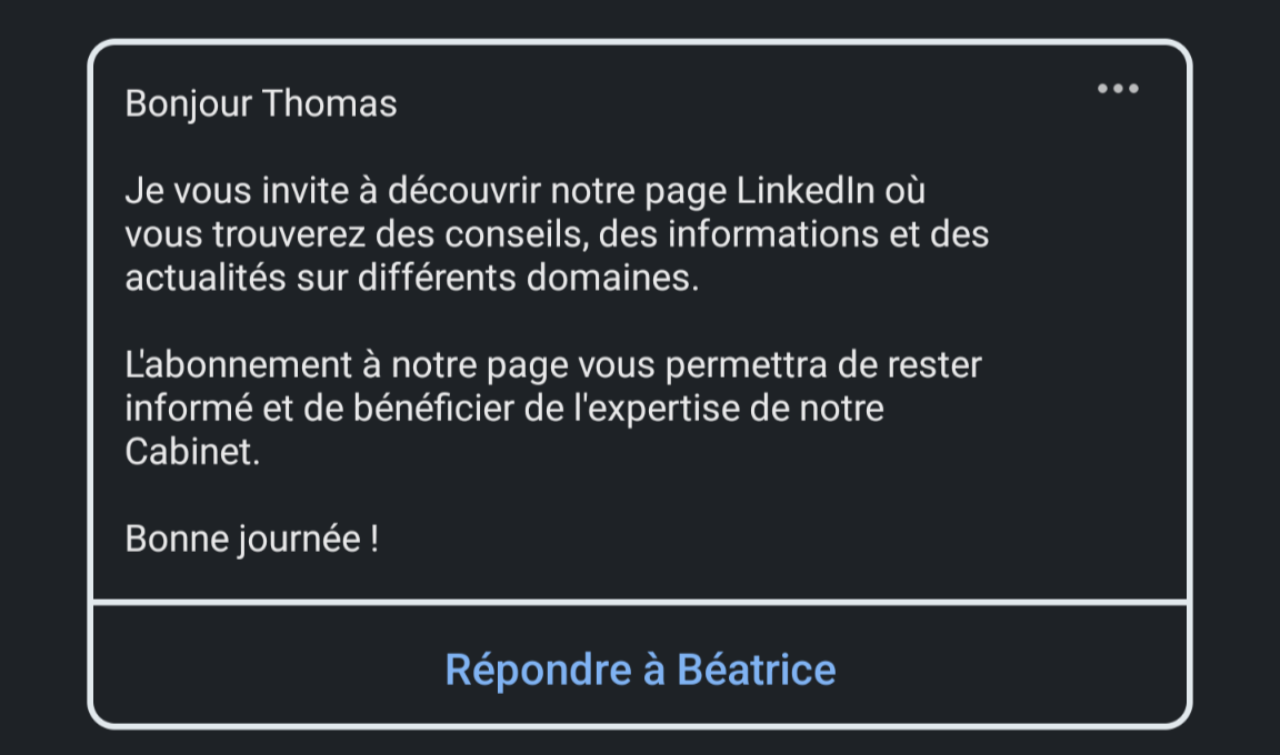 Ou alors je peux ajouter tes process sur mes comptes sous un format prestation de service et je laisserai la gestion du compte LinkedIn ce qui te sera moins couteux en temps et en budget que de faire l’achat d’une licence Business
