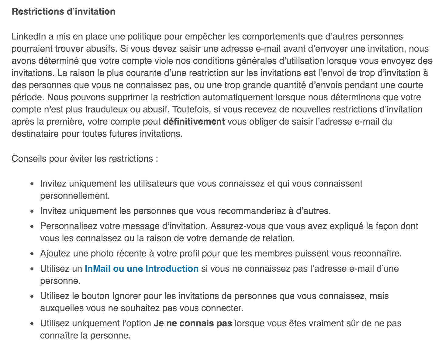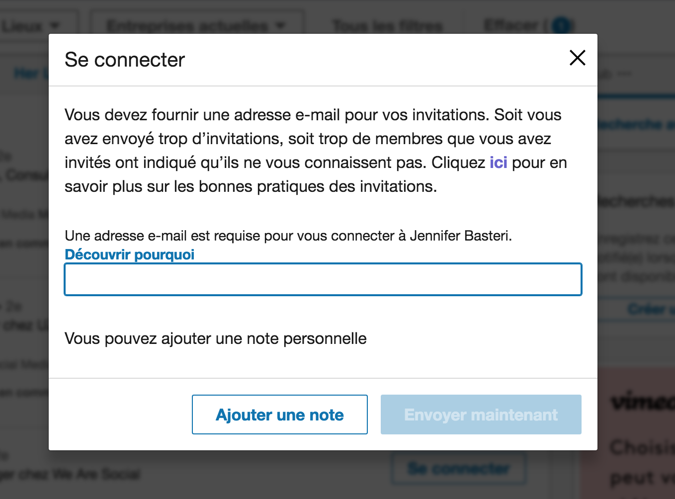 À noter qu’après avoir accepté de ne plus utiliser Linked Helper je suis bloqué dans l’envoie de mes invitations (un mail est systématiquement demandé et l’invitation échoue toujours).