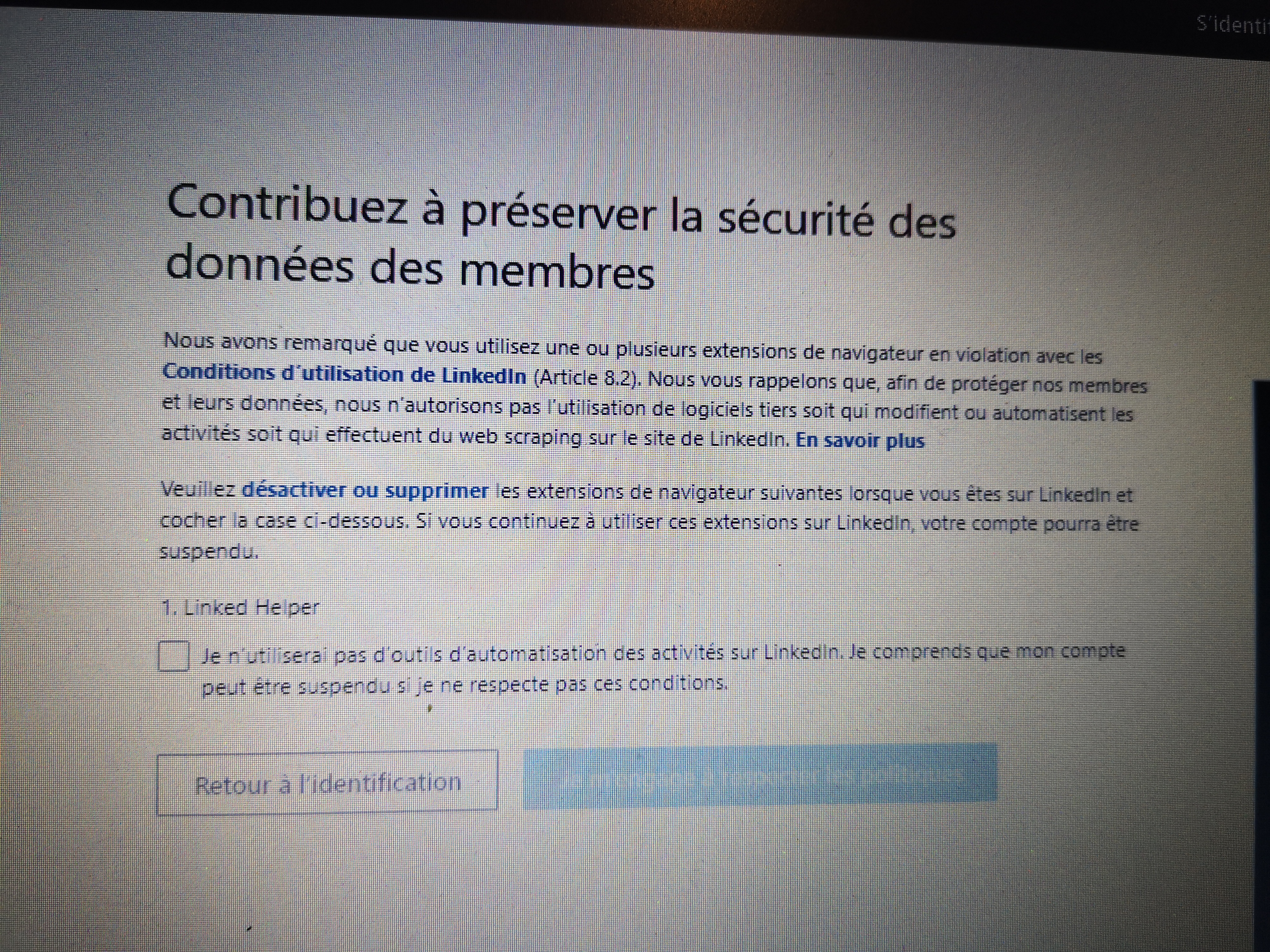 Je viens vers vous car, alors même que je fait une pause de 2/3 jours avec Linked Helper (car en vacances), j’ai pu constater le message suivant en me connectant :