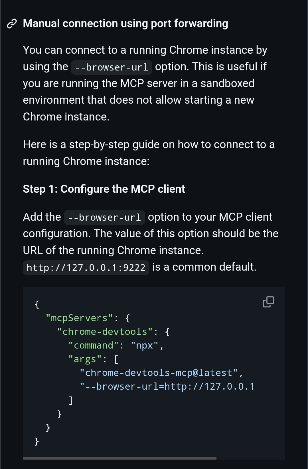 j’aimerais utiliser le mcp dev tool Chrome, sur mon serveur Linux, mais en utilisant un Chrome qui est sur mon PC Windows. Est-ce qu’il y a des gens qui ont trouvé des solutions ou c’est impossible ?