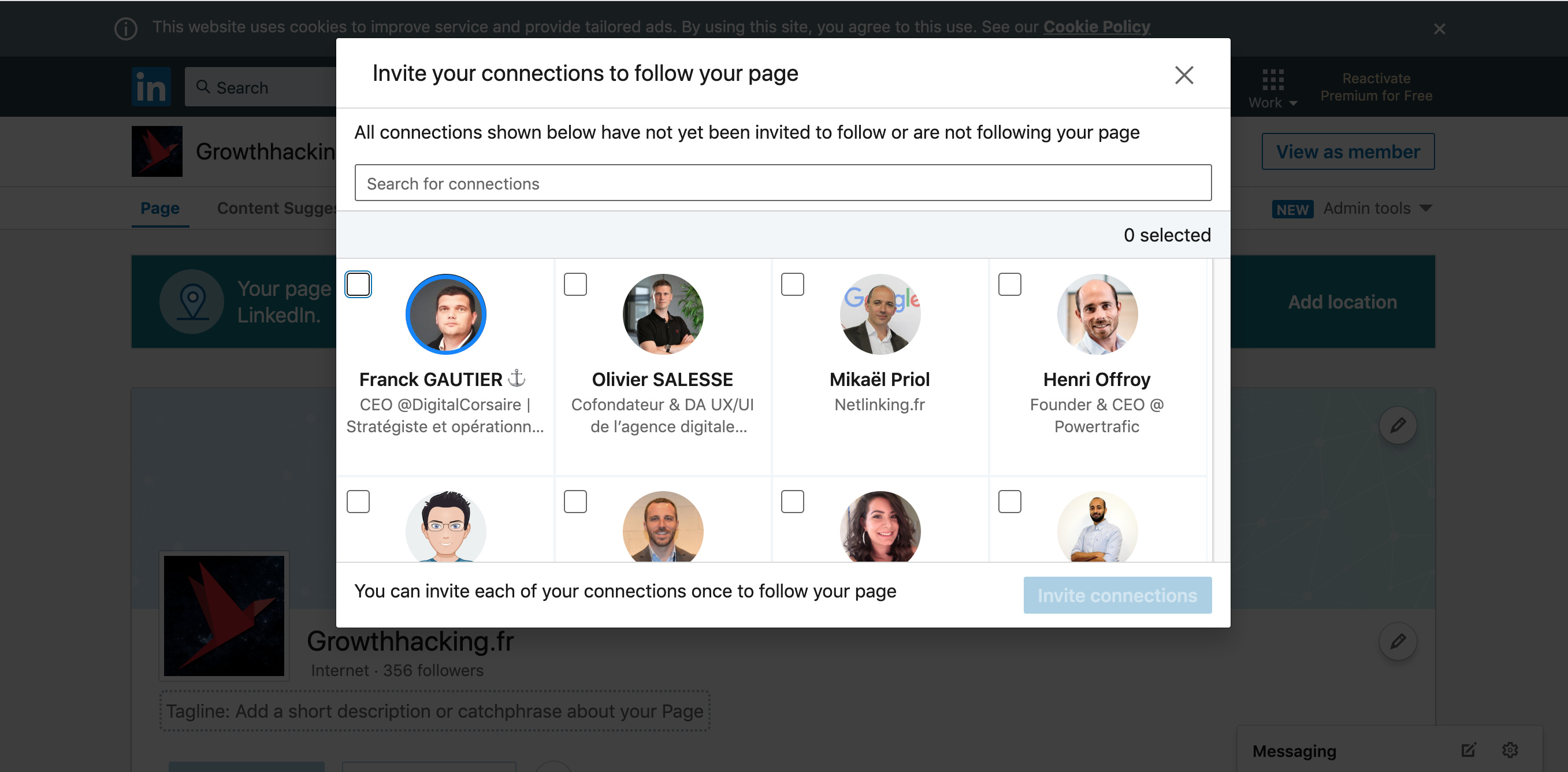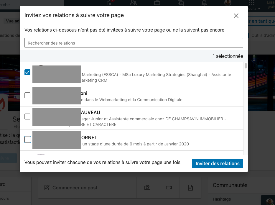 Ensuite, le clic pour inviter à aimer la page ne fonctionne pas pour moi. Nous sommes 7 admins de page sur le LinkedIn de ma boite, et un seul peu inviter avec ta fonctionnalité (qui fonctionne !!). J’ai l’impression qu’il faut être le créateur de la page LinkedIn. Les admins rajoutés après n’ont pas accès à la fonctionnalité.