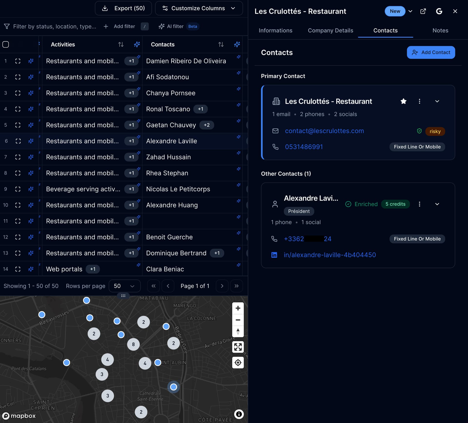 Je prospecte des gérants de restaurants - j’ai d’abord utilisé linkedin pour trouver des gérants dans certaines régions cibles (comme Pays de la Loire). Mais j’arrive un peu au bout des contacts qui sont sur linkedin - sachant que j’ai besoin de leur linkedin pour trouver des numéros de téléphone.