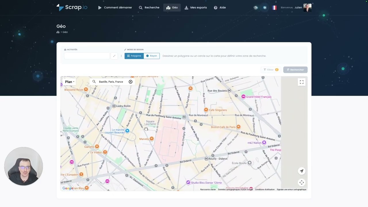 Recherche géographique — dessinez une zone sur la carte, et faites une recherche avec des polygones jusqu’à 100 points.