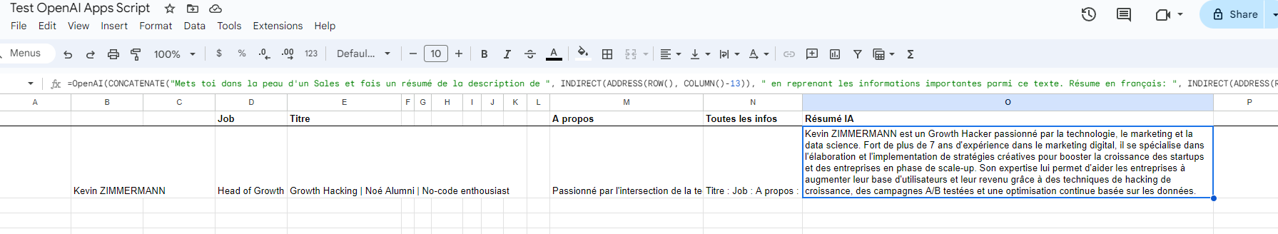 La formule dans le Google Sheets : =OpenAI(CONCATENATE("Mets toi dans la peau d'un Sales et fais un résumé de la description de ", INDIRECT(ADDRESS(ROW(), COLUMN()-13)), " en reprenant les informations importantes parmi ce texte. Résume en français: ", INDIRECT(ADDRESS(ROW(), COLUMN()-1))))