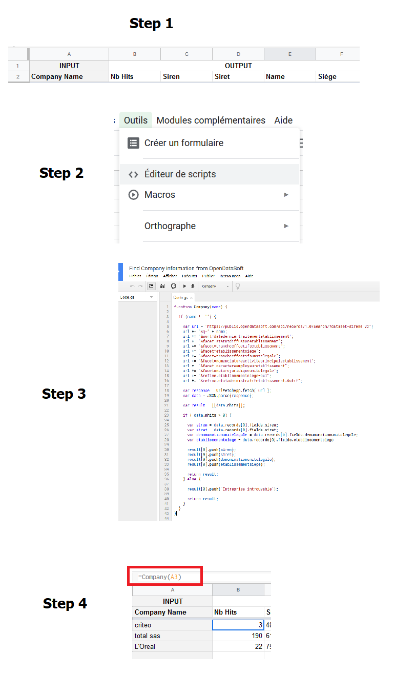 Pour chaque entreprise présente dans un Google Sheet, il suffit alors d’envoyer la requête API. Forcément les requêtes qui retournent plusieurs établissements peuvent être un peu compliquée à gérer.