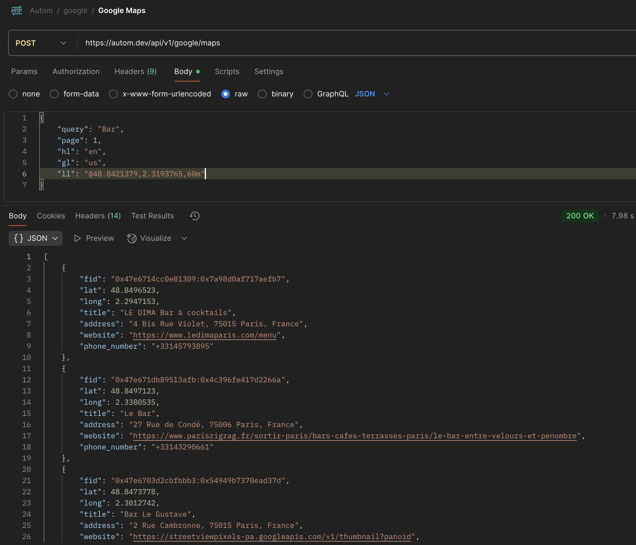 Si tu es développeur, il y a des APIs pour automatiser plus massivement Google Maps. En revanche je pense que tu devrais plus “focus” ta recherche dans la zone par exemple “bar” avec la latitude et longitude. Car la recherche “Montparnasse Tower” c’est comme dire “Maison” (mais du coup une petite maison, une grande maison, une maison à étages?) . Pour te donner une idée sur “bar” avec un scraper api: