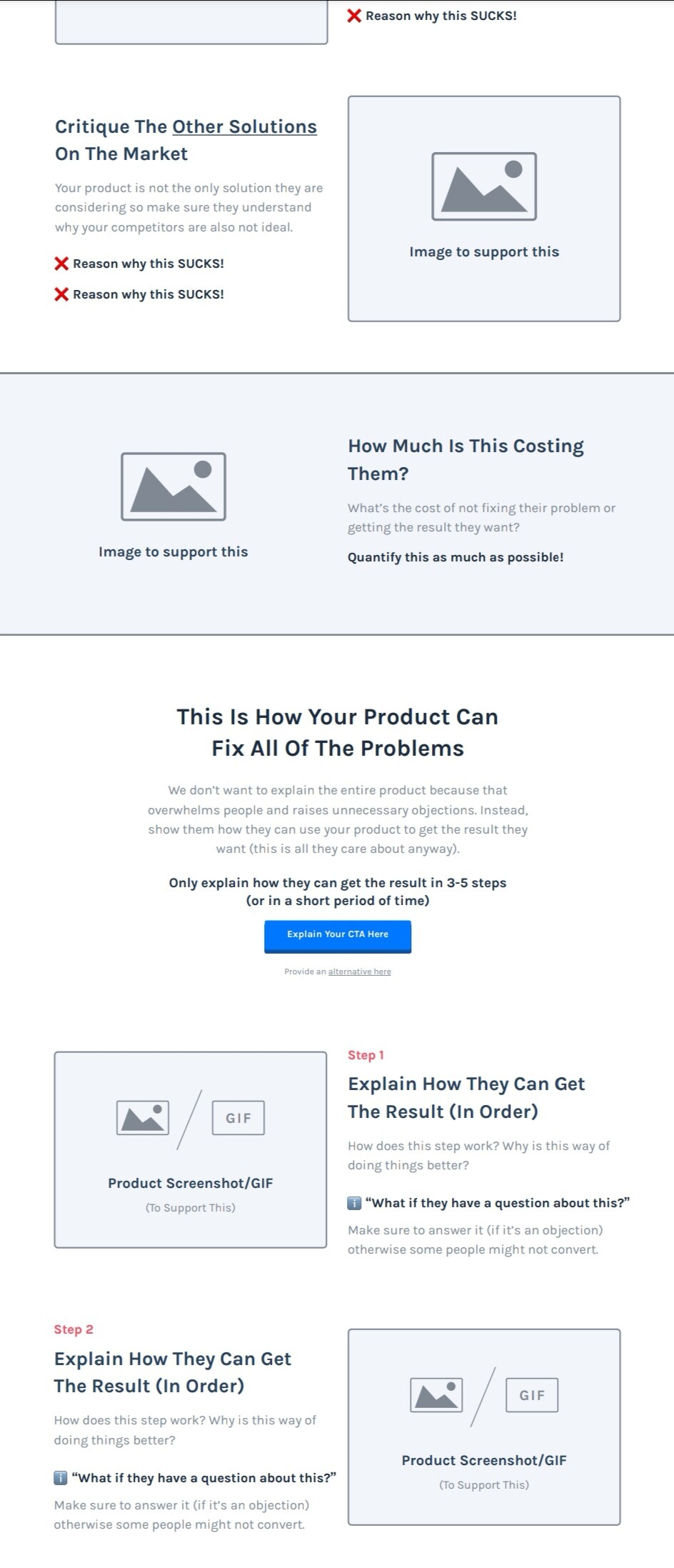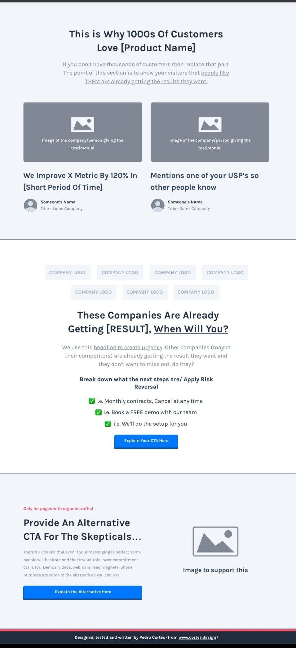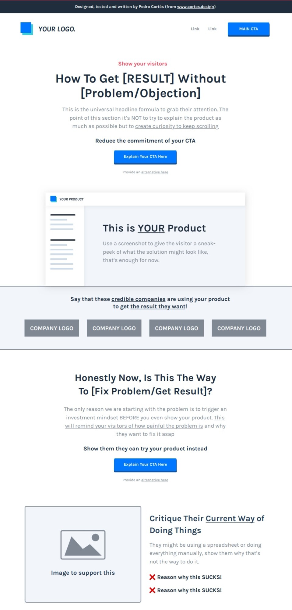 J’ai trouvé ce modèle de landing pour SaaS intéressant pour l’aide que cela fourni dans la manière de rédiger le contenu et qui est censé mieux convertir (exemple de l’accroche dans le header : Comment obtenir tel « résultat » sans « contrainte ») [source cortes.design] :