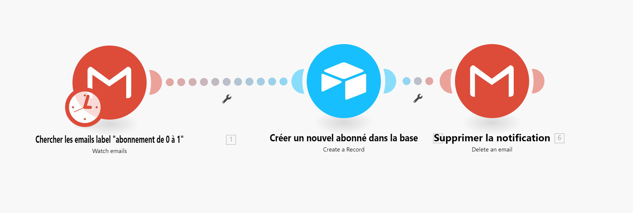 Automatiser depuis Make (le scénario fait remonter une fois par jour les emails avec ce nouveau label, enregistre l’email inscrit par Substack en « Reply To » = le/la nouvel.le abonné.e, pour l’intégrer dans une base - ici Airtable - puis supprimer l’email de notification histoire de garder une boîte propre)