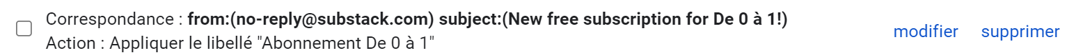 Créer une règle d’attribution d’un label dans Gmail (boîte qui réceptionne les notifications Substack) à partir d’un filtre.