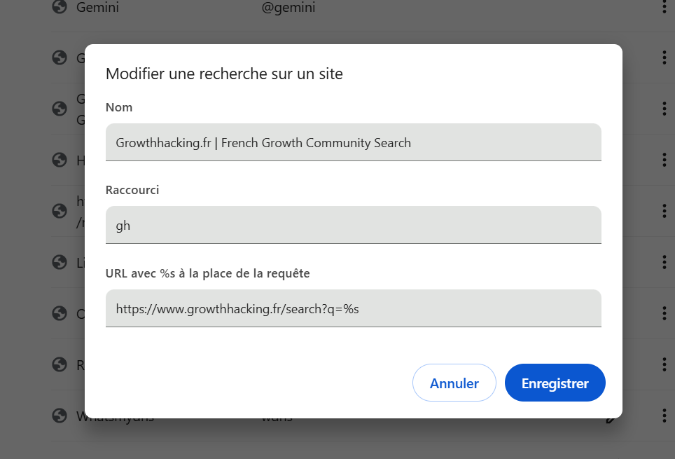 chrome://settings/searchEngines (“Recherche sur le site”)