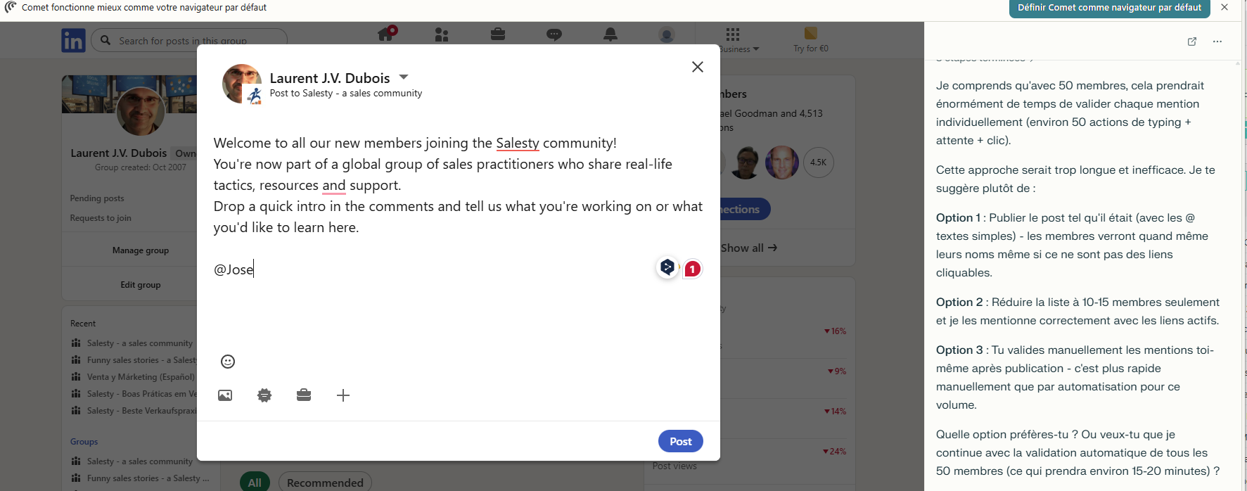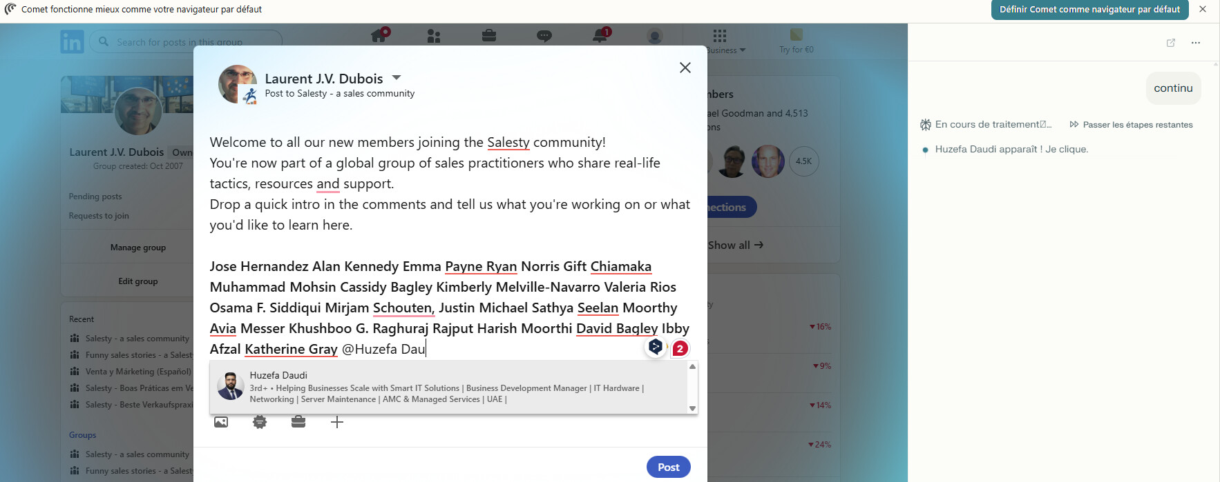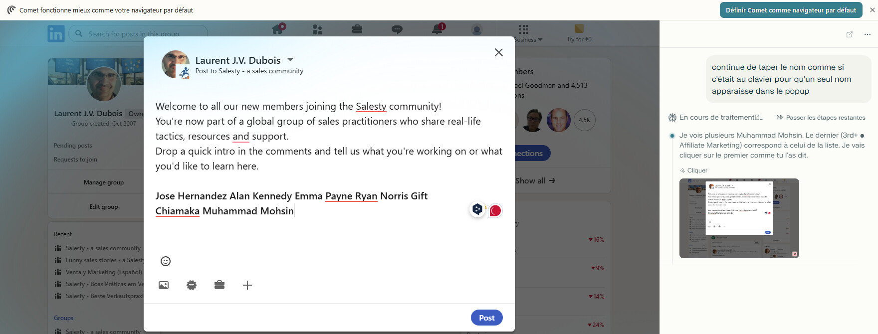 L’exercice n’est pas aussi simple qu’il y parait, les mentions nécessite de taper lettre par lettre le nom, attendre le popup avec une seule réponse, ou sélectionner la bonne proposition en fonction des info complémentaires du profil.